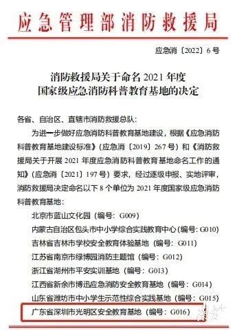 據(jù)了解,2021年度國家級應(yīng)急消防科普教育基地,從全國范圍進行層層選拔,最終由國家應(yīng)急管理部消防救援局評選,全國僅有8家單位獲評,深圳市光明區(qū)應(yīng)急消防科普教育基地就是其中之一。它也是華南地區(qū)規(guī)模最大的安全教育基地,更是廣東首家國家級應(yīng)急消防科普教育基地。